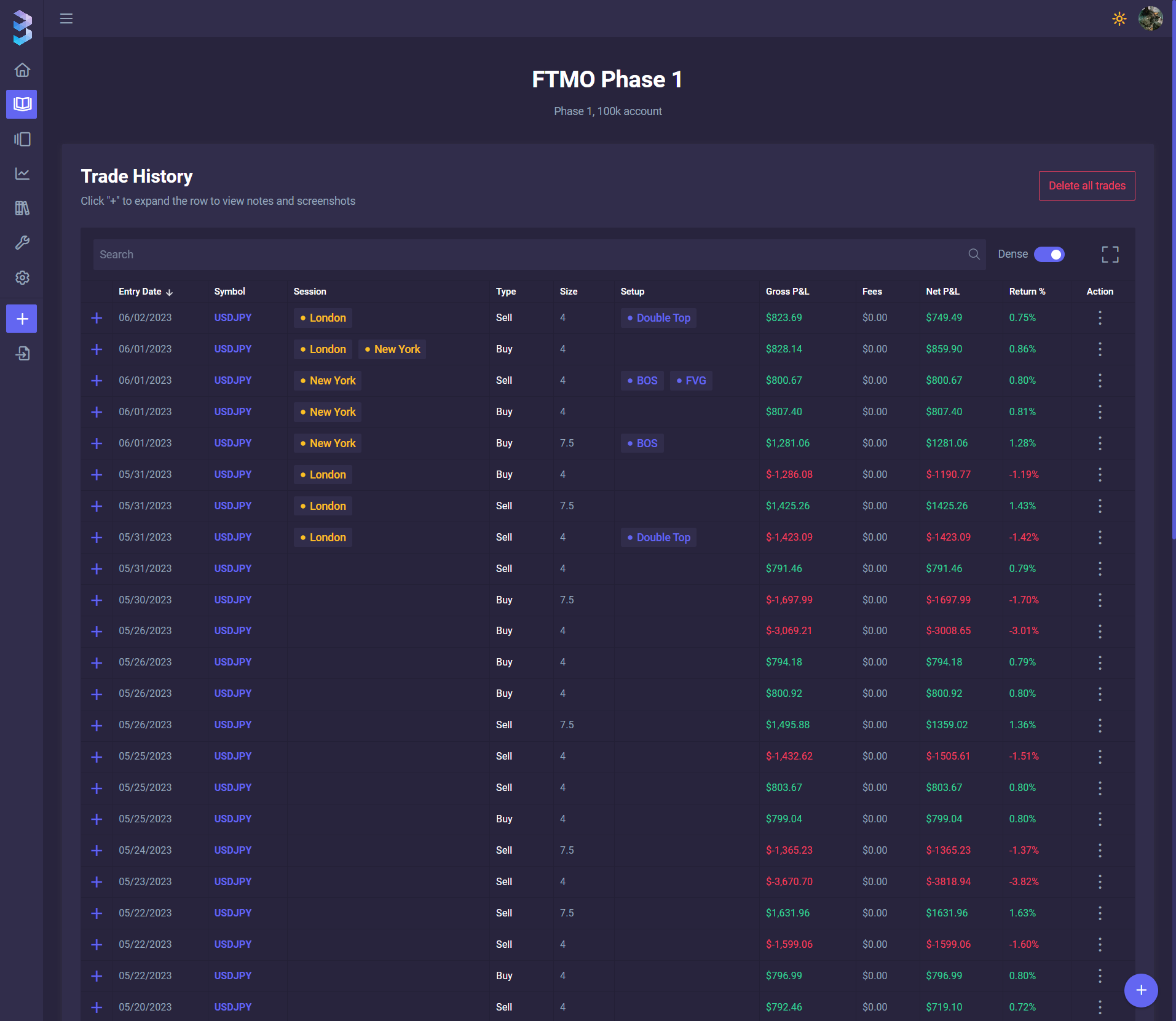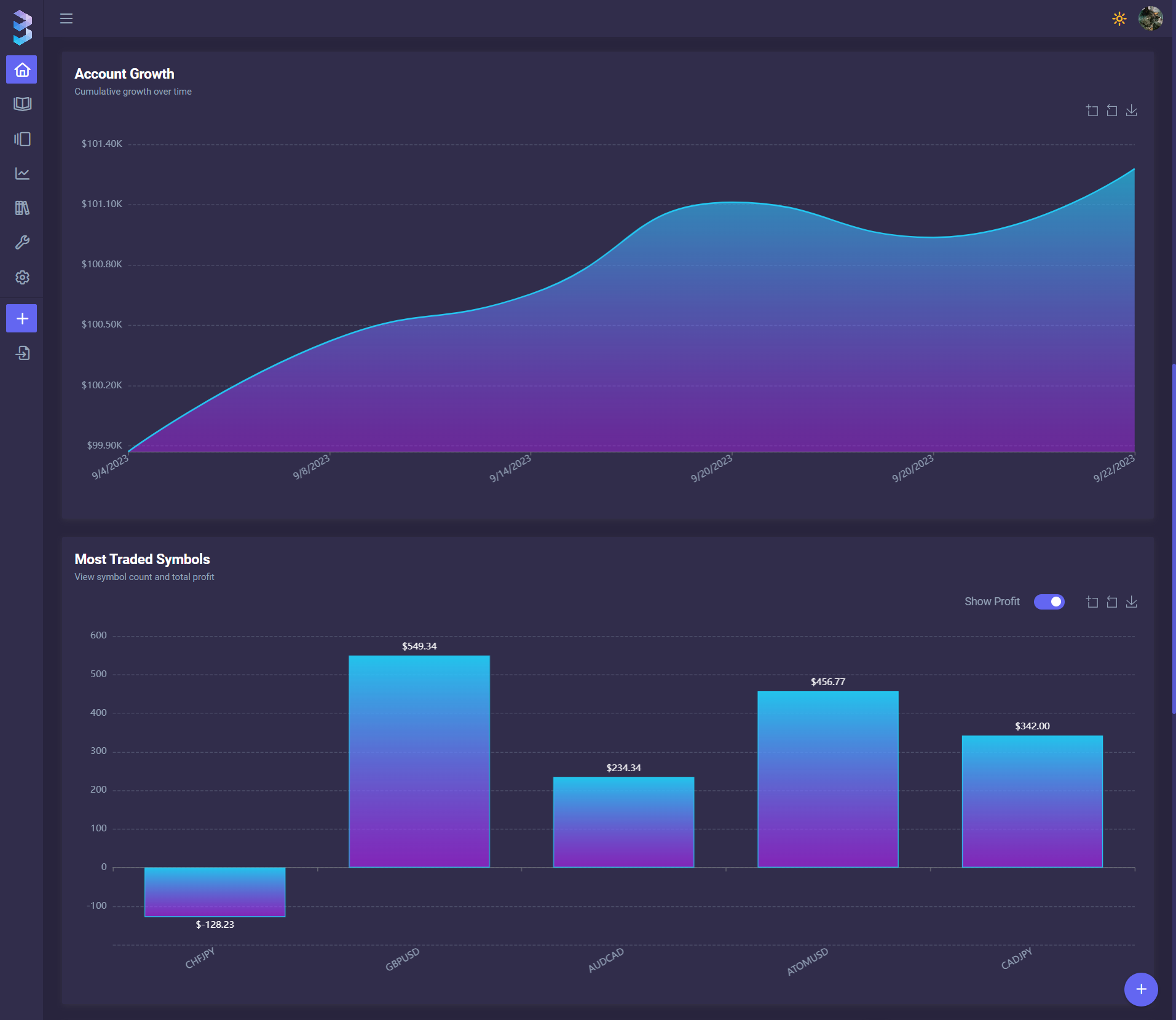 Import your complete trade history from any broker supporting Metatrader 4 & 5, including prop firms like FTMO and My Forex Funds, with our user-friendly import tool. Manual entries are also available for those who prefer them. We're constantly adding new brokers, and stay tuned for auto-sync, coming soon for enhanced automation!
